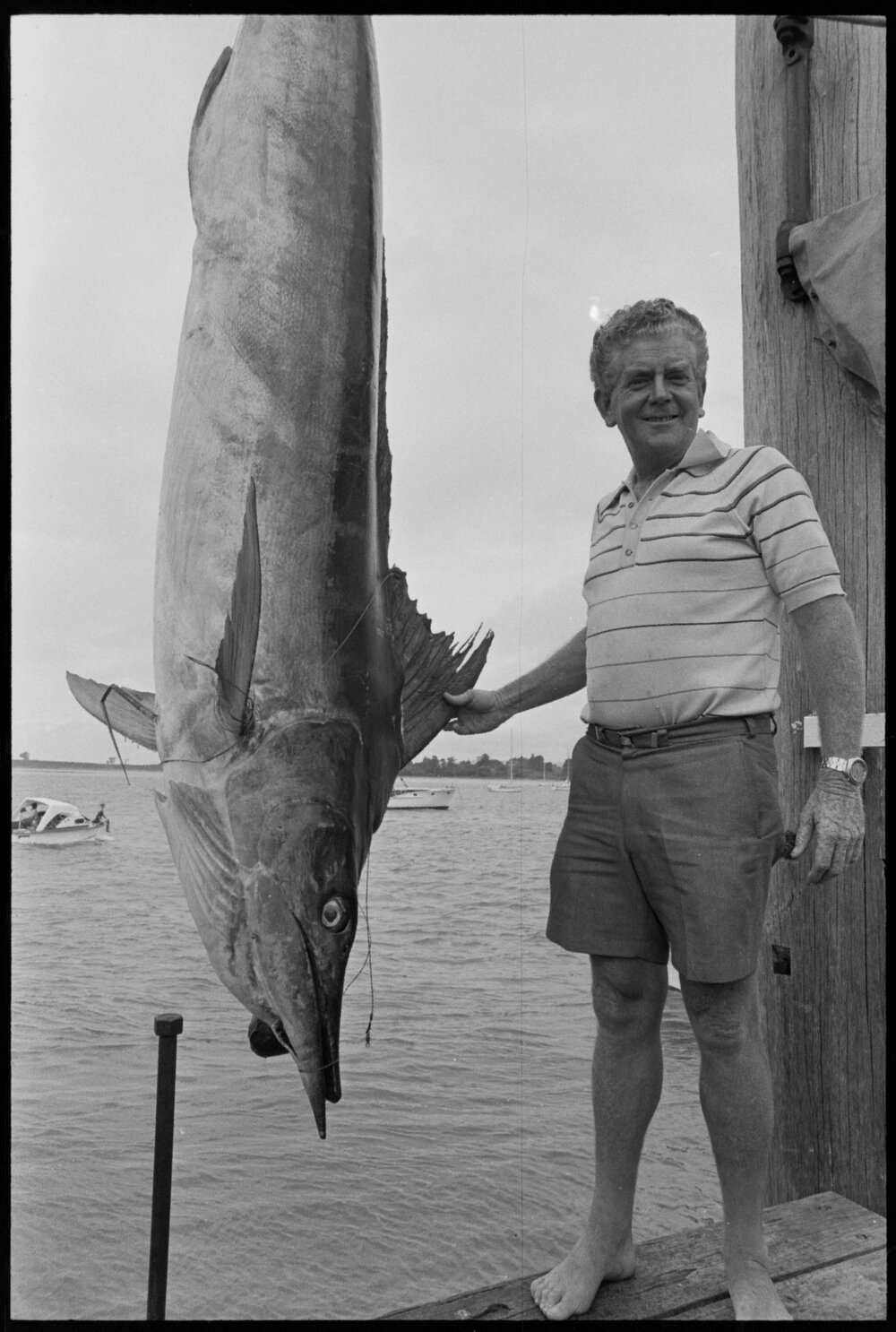 Date2 January 1975Reference Numberphoto gcc-31535DescriptionJohn Boyle, of Tauranga, who landed the 398 lb possible world record striped marlin hung at the Strand Reclamation, on 130 lb gear. A record claim for it will be lodged by the Tauranga Big Game Fishing Club. Published 2 January 1975.FormatNegativePhysical Description35mm black-and-white negative (12/14)Photographer/CreatorBay of Plenty Times