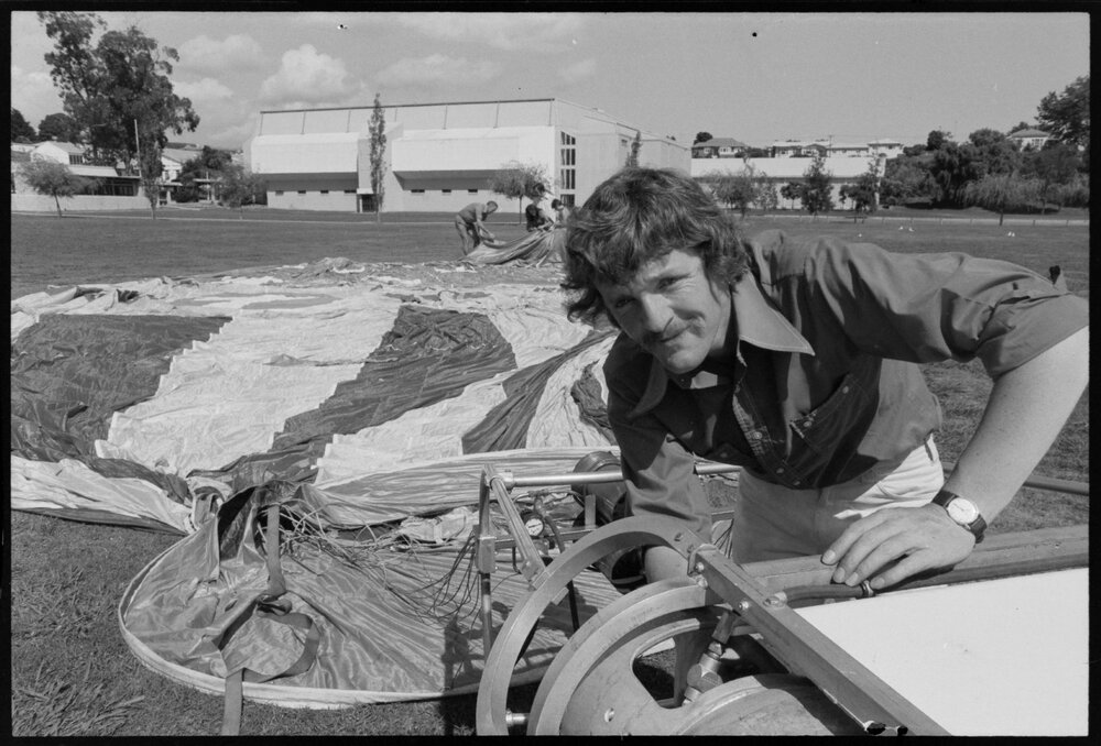 Date2 January 1975Reference Numberphoto gcc-31544DescriptionThis hot-air balloon will be an unusual attraction at the Tauranga 20,000 Club activities at Memorial Park. It is seen laid out before being inflated today. In the foreground checking the basket is the balloonist, Mr Winston Wealleans, of Christchurch. Behind him is his three-year-old son Timothy. Published 2 January 1975.FormatNegativePhysical Description35mm black-and-white negative (7/9)Photographer/CreatorBay of Plenty Times