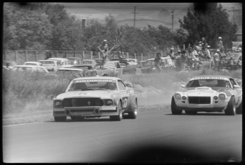 Date3 January 1975Reference Numberphoto gcc-31568DescriptionJim Richards leads Red Dawson out of Rothmans curve in the last of the "Big Banger" races at Bay Park Raceway's international meeting. Dawsons motor let out a cloud of white smoke here on the next lap as he left the corner at near 120 m.p.h. He pitted for the rest of the race. Published 3 January 1975.FormatNegativePhysical Description35mm black-and-white negative (2/3)Photographer/CreatorBay of Plenty Times