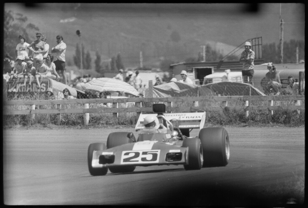 Date3 January 1975Reference Numberphoto gcc-31571DescriptionA former "Big Banger" saloon driver Graham Baker (Christchurch) drove his F5000 "A car" to third placing in the POSB series during his first season's racing in this class. Published 3 January 1975.FormatNegativePhysical Description35mm black-and-white negative (2/3)Photographer/CreatorBay of Plenty Times