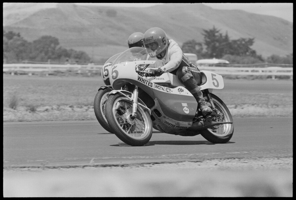 Date3 January 1975Reference Numberphoto gcc-31573DescriptionChristchurch rider Stu Avant (5) is shown passing Richard Pearce (Inglewood) on his way to a second placing in the 350 cc race at the Bay Park motorcycle meeting on New Year's Eve. Published 3 January 1975.FormatNegativePhysical Description35mm black-and-white negative (1/3)Photographer/CreatorBay of Plenty Times