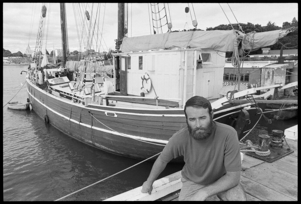Date6 January 1975Reference Numberphoto gcc-31622DescriptionThe unofficial skipper of the 200-ton schooner Topaz, Larry Cross, sits beside the former Baltic trader - sole asset of the Great Escape Corporation, at the port for two months for an overhaul. Published 6 January 1975.FormatNegativePhysical Description35mm black-and-white negative (1/6)Photographer/CreatorBay of Plenty Times