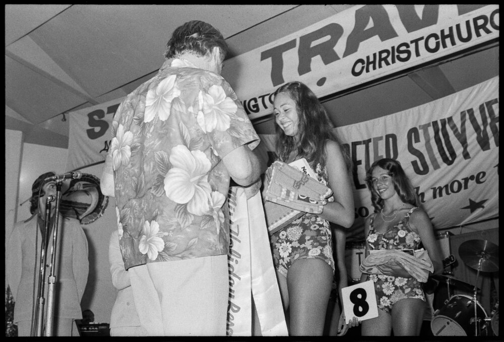 Date6 January 1975Reference Numberphoto gcc-31670DescriptionThe winner of the Miss New Zealand Holiday Resorts title, 17-year-old Glenys Ottaway receives her trophy, she represented Taranaki Beach at the contest in Tauranga. Published 6 January 1975. Published 6 January 1975.FormatNegativePhysical Description35mm black-and-white negative (5/6)Photographer/CreatorBay of Plenty Times