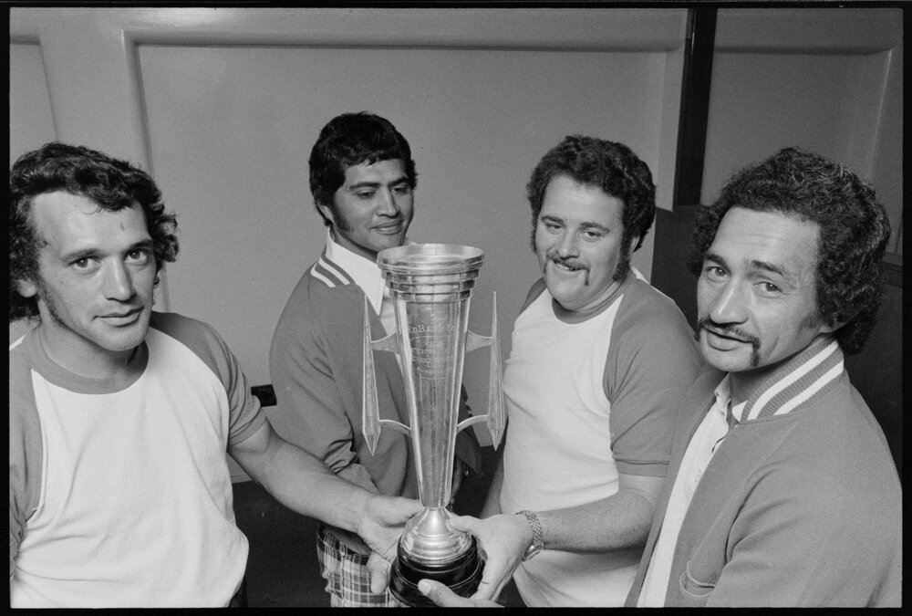 Date8 January 1975Reference Numberphoto gcc-31703DescriptionProudly displaying the Ed Barr Cup won by Bay of Plenty at the New Zealand men's provincial softball championships are from left Frank Winiata (captain) Joc Horne (coach) Dean Dormer (vice-captain) and Peter Paul manager. Published 8 January 1975.FormatNegativePhysical Description35mm black-and-white negative (3/6)Photographer/CreatorBay of Plenty Times
