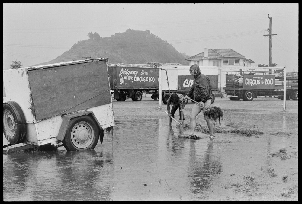 Date9 January 1975Reference Numberphoto gcc-31716DescriptionHeavy overnight rain at Mount Maunganui made circus hand Wally James' job a little more difficult as cleaning operations at Coronation Park got under way after a two-day stint by Ridgeway's Circus. Published 9 January 1975.FormatNegativePhysical Description35mm black-and-white negative (1/3)Photographer/CreatorBay of Plenty Times