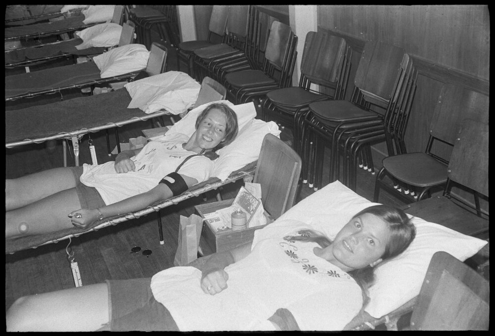 Date9 January 1975Reference Numberphoto gcc-31721DescriptionTaking time off from the surf, which neither girl had ever seen before, are Rotary Exchange students, Cindy Atherton, 17, of Wisconsin, left, and Teri Wilson, 16, of Idaho, who are pictured giving a pint of blood at the St. John Ambulance Hall at Mount Maunganui. Published 9 January 1975.FormatNegativePhysical Description35mm black-and-white negative (3/3)Photographer/CreatorBay of Plenty Times