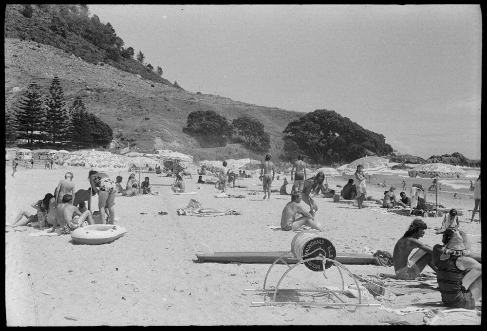 Date13 January 1975Reference Numberphoto gcc-31809DescriptionBeach umbrellas sprout on the Ocean Beach at Mount Maunganui, a surf lifesaving reel is in the bottom right of the photo. Published 13 January 1975.FormatNegativePhysical Description35mm black-and-white negative (1/6)Photographer/CreatorBay of Plenty Times