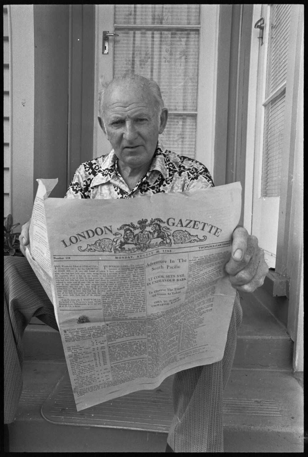 Date14 January 1975Reference Numberphoto gcc-31844DescriptionMr Carter settles on his back steps to read the London Gazette, one of a bundle of old newspapers found by his son in law in a house in Australia. Published 14 January 1975.FormatNegativePhysical Description35mm black-and-white negative (1/14)Photographer/CreatorBay of Plenty Times