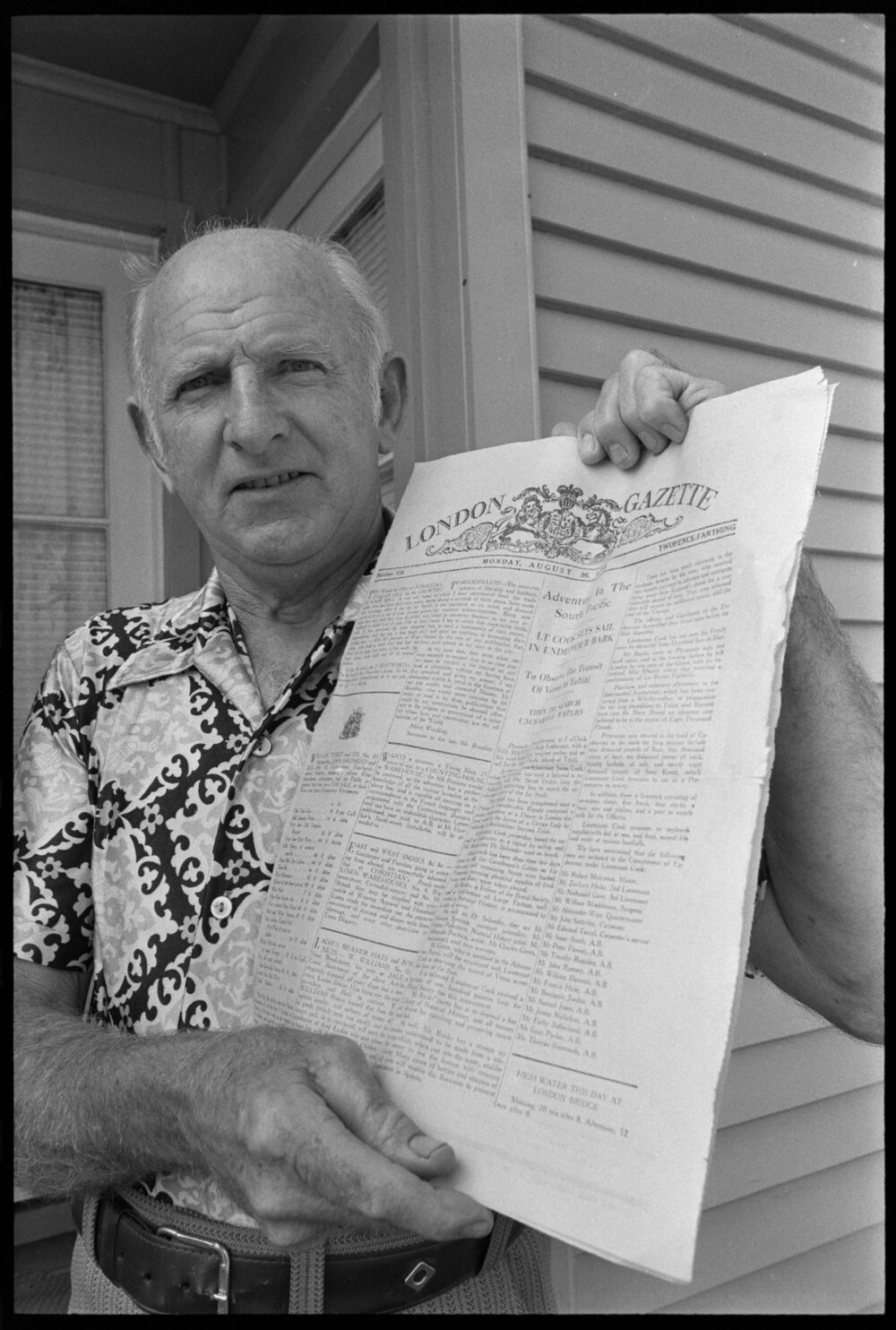Date14 January 1975Reference Numberphoto gcc-31847DescriptionMr Carter settles on his back steps to read the London Gazette, one of a bundle of old newspapers found by his son in law in a house in Australia. Published 14 January 1975.FormatNegativePhysical Description35mm black-and-white negative (4/14)Photographer/CreatorBay of Plenty Times