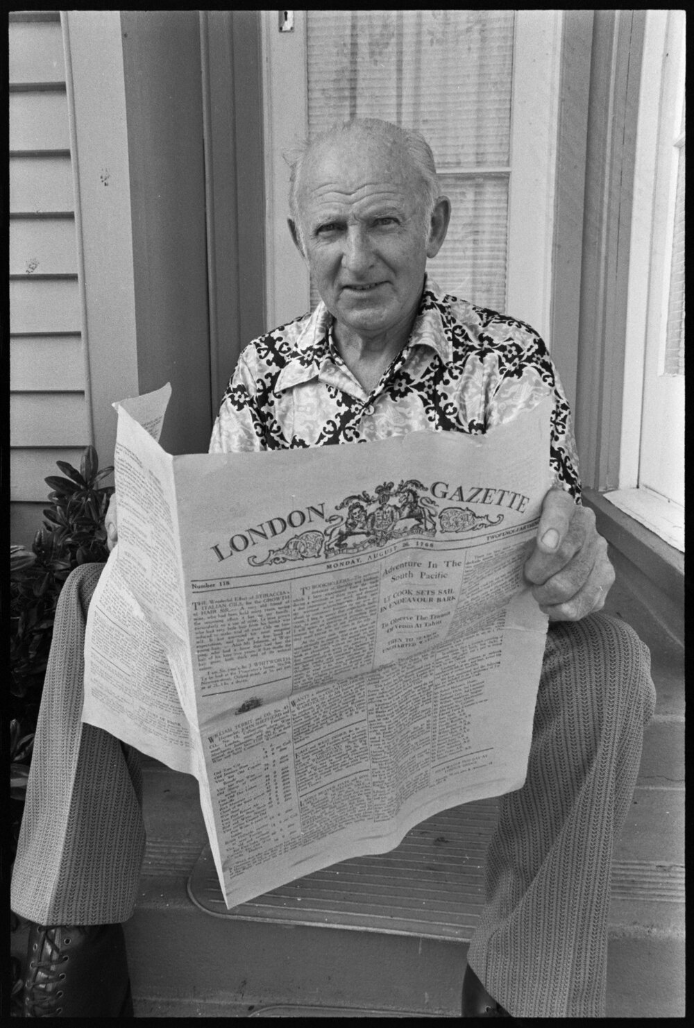 Date14 January 1975Reference Numberphoto gcc-31852DescriptionMr Carter settles on his back steps to read the London Gazette, one of a bundle of old newspapers found by his son in law in a house in Australia. Published 14 January 1975.FormatNegativePhysical Description35mm black-and-white negative (9/14)Photographer/CreatorBay of Plenty Times