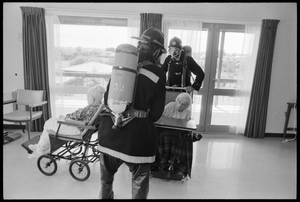 Date15 January 1975Reference Numberphoto gcc-31882DescriptionRest home residents Mesdames H. Boyd and E. Simmonds (front) are helped from Melrose Home by a nurse, Station Officer J. Hoskins and Fireman D. Rutherford (front) in the fire drill. Published 15 January 1975.FormatNegativePhysical Description35mm black-and-white negative (3/12)Photographer/CreatorBay of Plenty Times