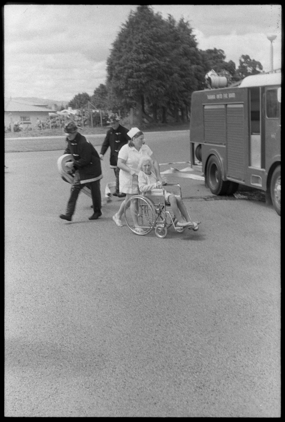 Date15 January 1975Reference Numberphoto gcc-31885DescriptionFirefighters and a nurse help residents evacuate at a Melrose Home fire drill. Published 15 January 1975.FormatNegativePhysical Description35mm black-and-white negative (6/12)Photographer/CreatorBay of Plenty Times