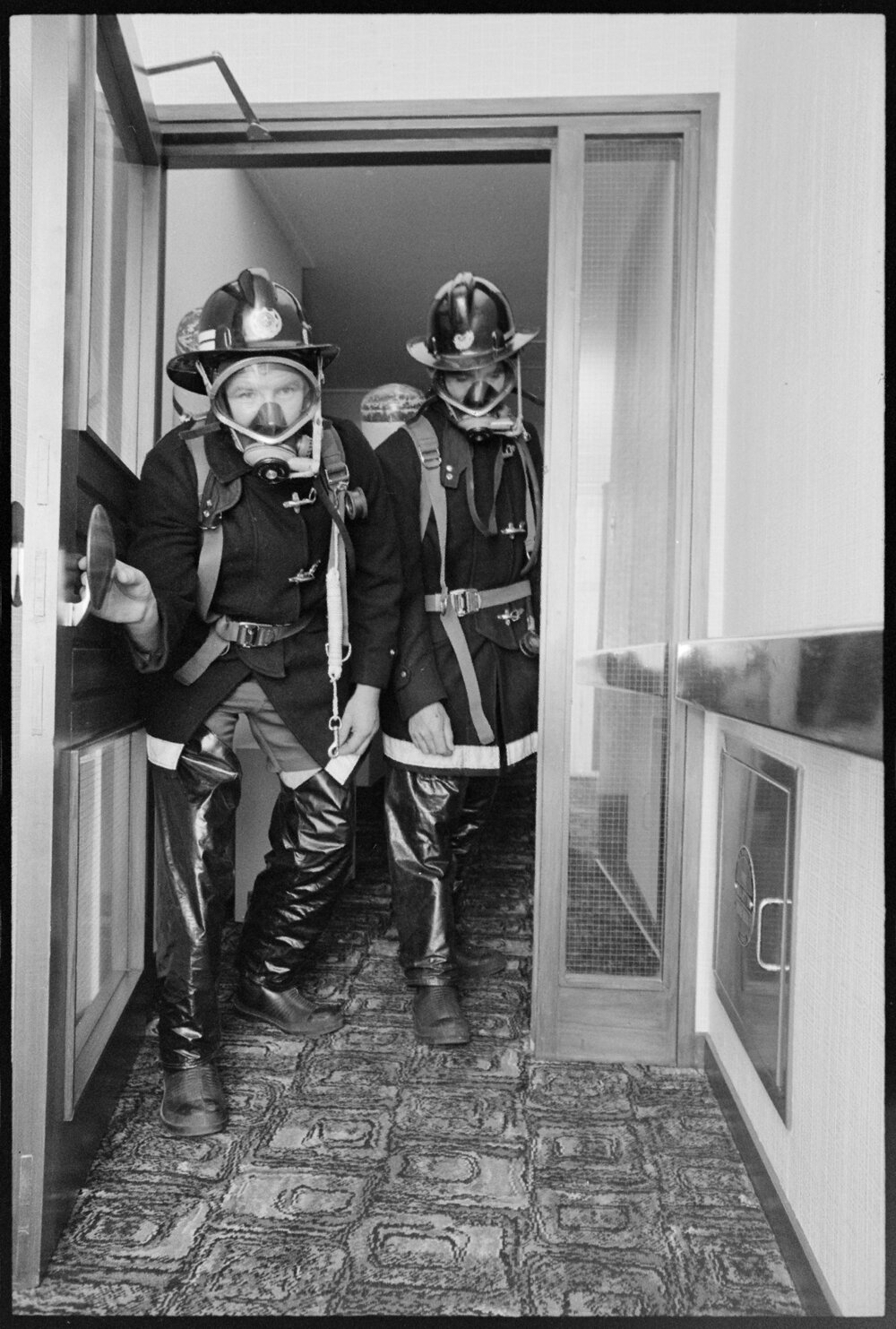Date15 January 1975Reference Numberphoto gcc-31888DescriptionFire fighters at a Melrose Home fire drill. Published 15 January 1975.FormatNegativePhysical Description35mm black-and-white negative (9/12)Photographer/CreatorBay of Plenty Times