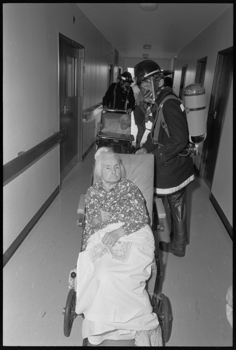 Date15 January 1975Reference Numberphoto gcc-31890DescriptionRest home residents Mesdames H. Boyd and E. Simmonds (front) are helped from Melrose Home by a nurse, Station Officer J. Hoskins and Fireman D. Rutherford (front) in the fire drill. Published 15 January 1975.FormatNegativePhysical Description35mm black-and-white negative (11/12)Photographer/CreatorBay of Plenty Times