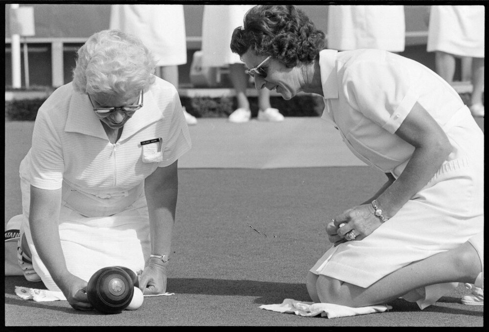 Date15 January 1975Reference Numberphoto gcc-31894DescriptionLawn Bowls. Bowlers Mrs. R. Harting (left) Putāruru, Mrs. E. Adam, of Whakatāne attemp to determine the closest bowl to the kitty. Published 15 January 1975.FormatNegativePhysical Description35mm black-and-white negative (3/5)Photographer/CreatorBay of Plenty Times