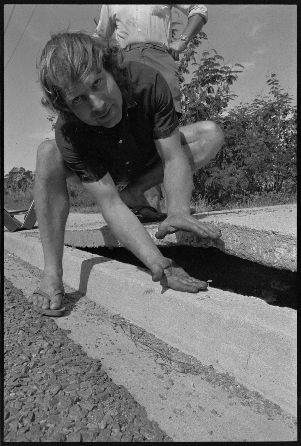 Date15 January 1975Reference Numberphoto gcc-31902DescriptionExpansion caused heat caused a section of footpath in Fraser Street, Tauranga, to buckle and lift. Here the resulting gap is indicated by Mr H. J. Meijer. Published 15 January 1975.FormatNegativePhysical Description35mm black-and-white negative (1/7)Photographer/CreatorBay of Plenty Times