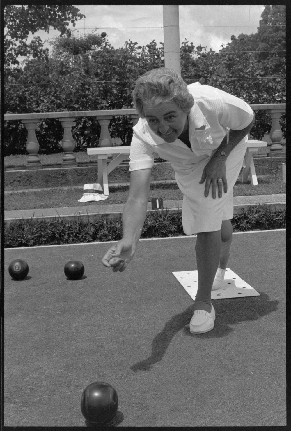 Date16 January 1975Reference Numberphoto gcc-31909DescriptionBowler Mrs Elsie Wilkie, a member of the Walton Bowling Club, shows the style which won her the Waikato Sportswoman of the Year award last year. She is representing Walton at the Tauranga Women's Combined Clubs annual bowling tournament in Tauranga. Published 16 January 1975.FormatNegativePhysical Description35mm black-and-white negative (1/6)Photographer/CreatorBay of Plenty Times