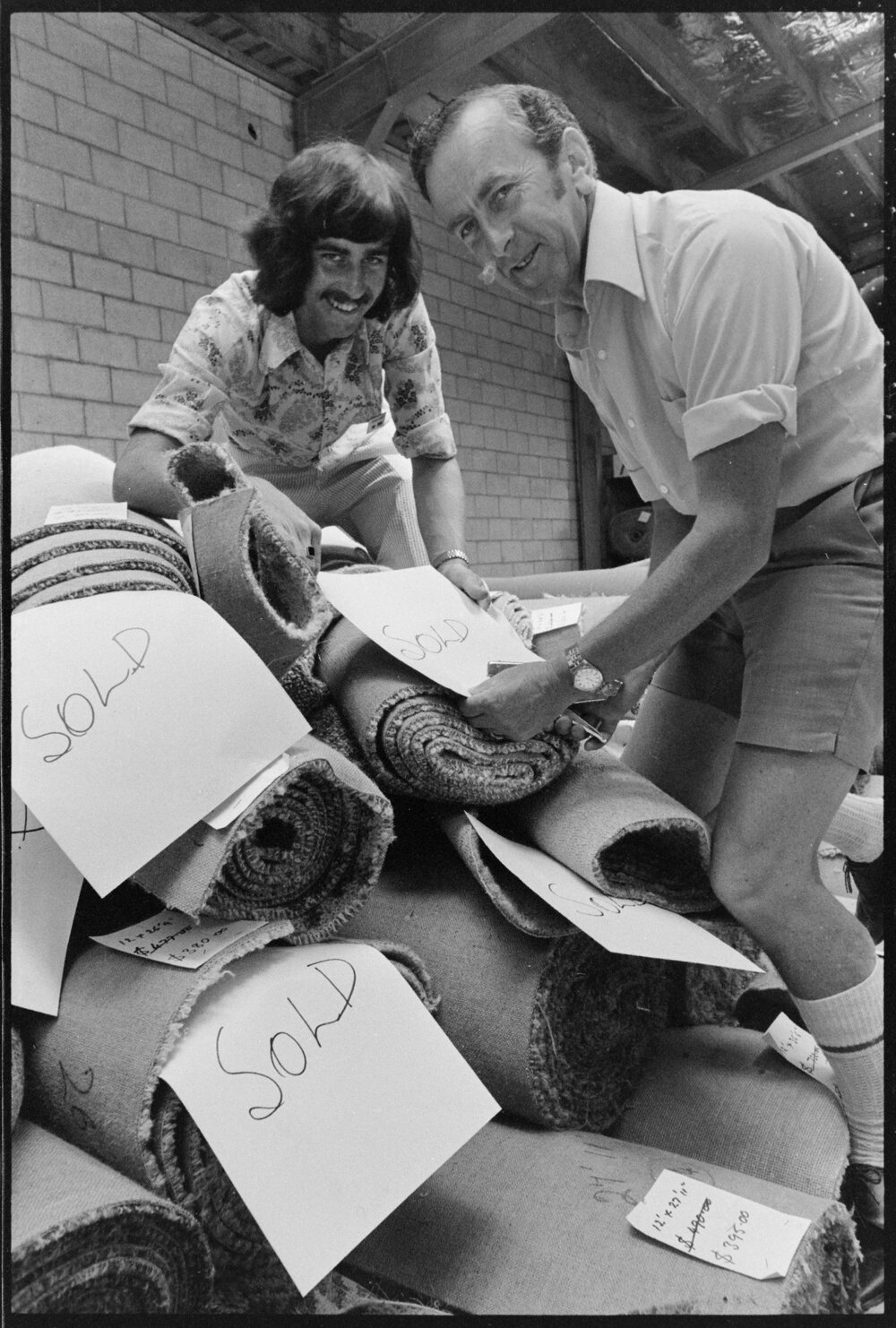 Date16 January 1975Reference Numberphoto gcc-31933DescriptionChristies salesman Mr M. J. Guy (left) and sales manager Mr O. R. Gilder, attach "sold" labels to some of the carpets which went in the first hour of the storeroom sale. Published 16 January 1975.FormatNegativePhysical Description35mm black-and-white negative (1/3)Photographer/CreatorBay of Plenty Times