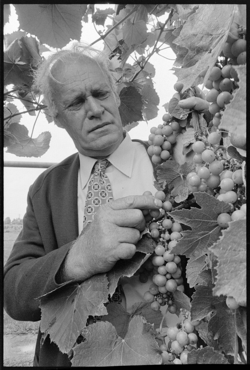 Date17 January 1975Reference Numberphoto gcc-31954DescriptionDairy farmer Mr. E. W. Bragg, who has farmed on the Maketū-Paengaroa Road for 40 years started experimenting with making wine over 20 years ago, trying various types including parsnip and kiwifruit wine. Despite many unsuccessful attempts, he continued at the instigation of his wife. He checks the growth of the crop on one of his oldest vines, which now forms an archway over his entrance drive. Published 17 January 1975.FormatNegativePhysical Description35mm black-and-white negative (1/8)Photographer/CreatorBay of Plenty Times