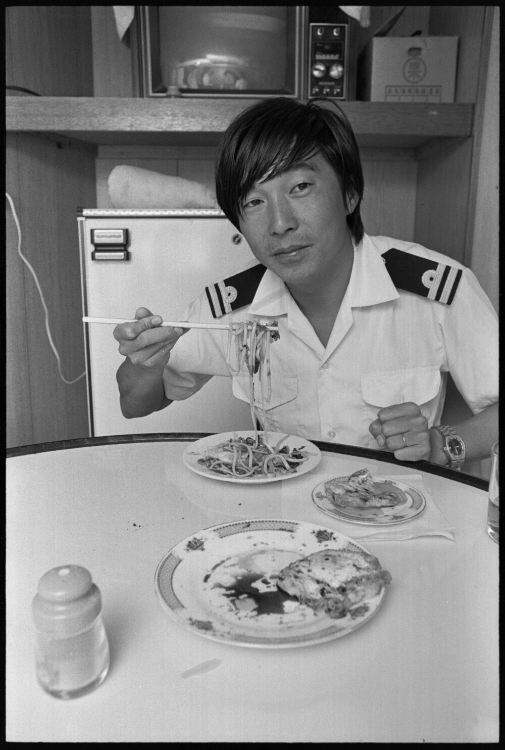 Date18 January 1975Reference Numberphoto gcc-32003DescriptionAn officer of the Golden Jade freighter eats a meal in the mess. Published 18 January 1975.FormatNegativePhysical Description35mm black-and-white negative (3/5)Photographer/CreatorBay of Plenty Times