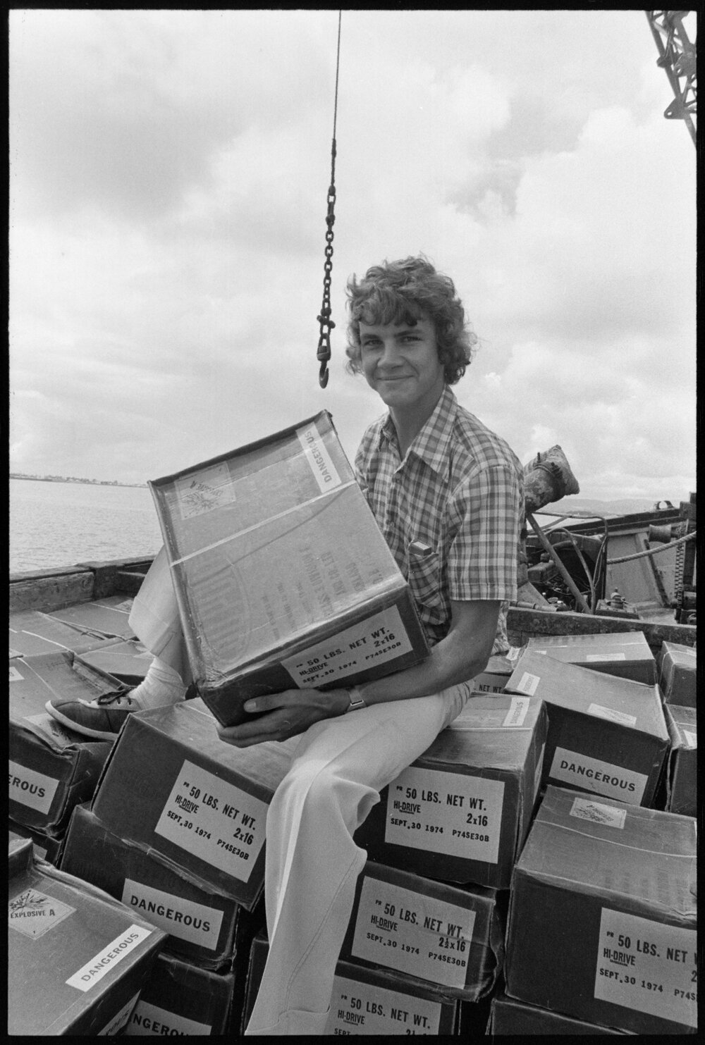 Date18 January 1975Reference Numberphoto gcc-32006Description A watersider stacks cartons of explosive aboard the Auckland scow Alma moored alongside the Golden Jade. The Alma ferried its cargo to the permanent explosive storage area a further three miles up the western channel. Published 18 January 1975.FormatNegativePhysical Description35mm black-and-white negative (1/14)Photographer/CreatorBay of Plenty Times