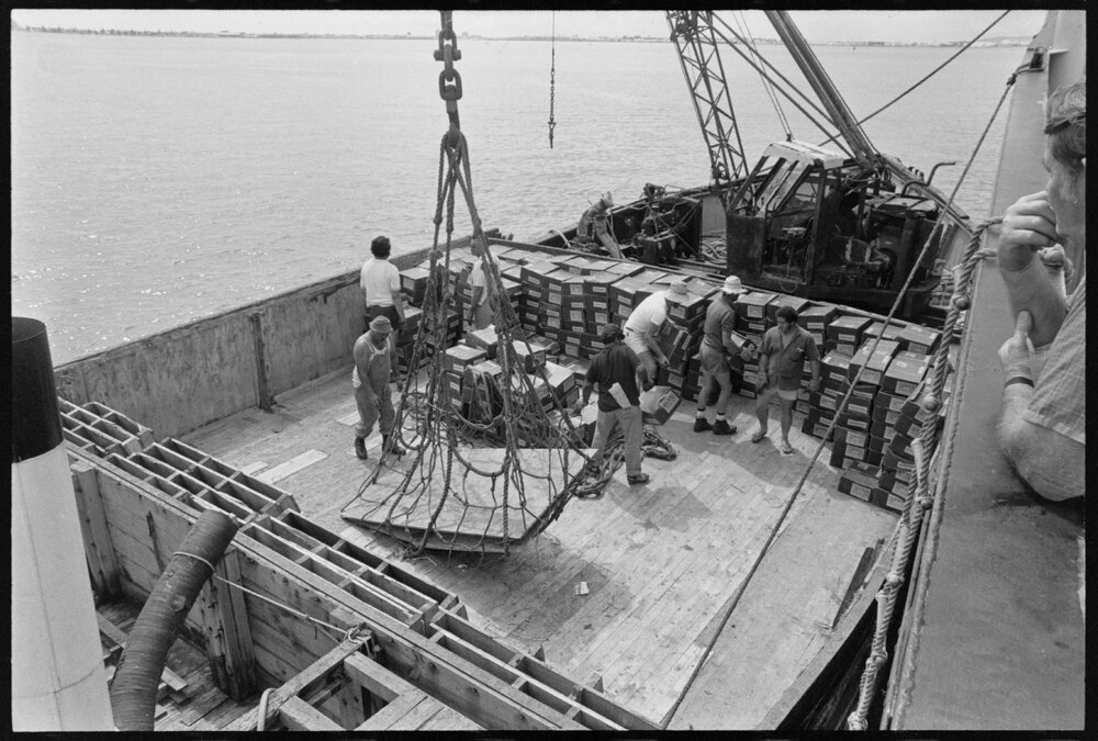 Date18 January 1975Reference Numberphoto gcc-32014DescriptionSpace is cleared on the deck of a barge for another netful of high explosive during unloading of the Golden Jade. Published 18 January 1975.FormatNegativePhysical Description35mm black-and-white negative (9/14)Photographer/CreatorBay of Plenty Times