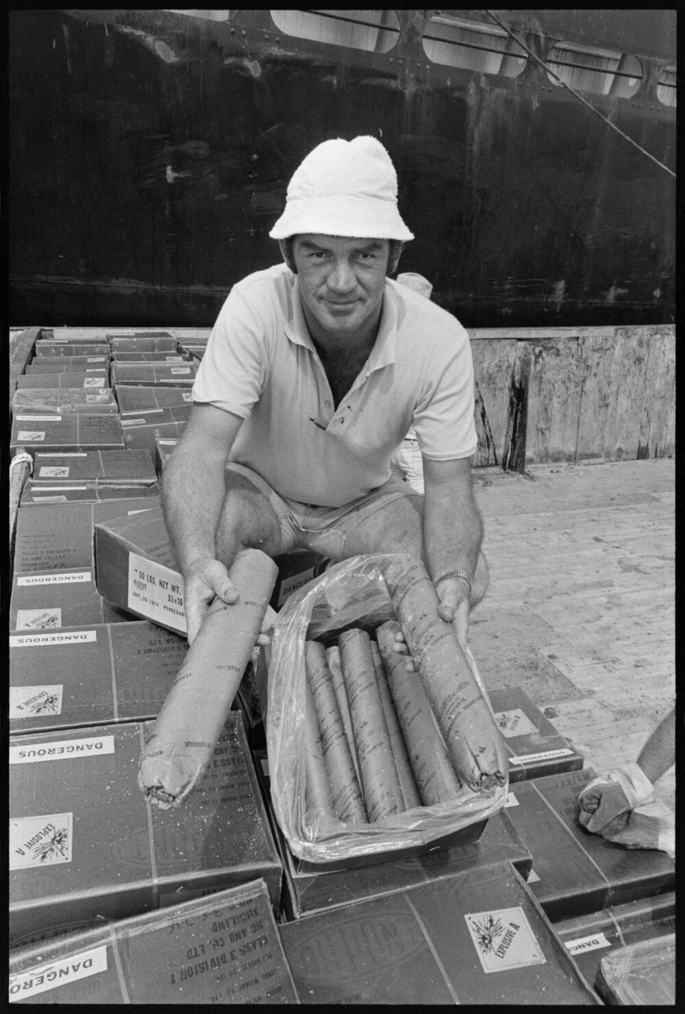 Date18 January 1975Reference Numberphoto gcc-32021DescriptionMr A. J. McKenzie, senior inspector of explosives for the Internal Affairs Department, checks one of the cartons of 2½in plugs of high explosive aboard the Golden Jade freighter. Published 18 January 1975.FormatNegativePhysical Description35mm black-and-white negative (2/3)Photographer/CreatorBay of Plenty Times