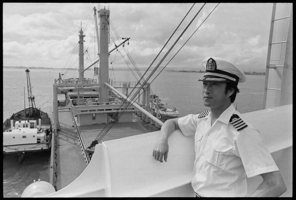 Date18 January 1975Reference Numberphoto gcc-32023DescriptionCaptain Y. R. Tai on the bridge of the latest addition to the Golden Hill Company of Taiwan's fleet, the 6500 deadweight ton Golden Jade as she rides at anchor in the Port of Tauranga. Published 18 January 1975.FormatNegativePhysical Description35mm black-and-white negative (1/3)Photographer/CreatorBay of Plenty Times