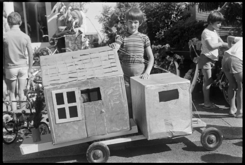 Date21 January 1975Reference Numberphoto gcc-32071DescriptionWaihī Festival. Peter Hardy with a house transport vehicle made from cardboard. The effort won him first prize in the decorated trolly section of the Waihī festival parade. Published 21 January 1975.FormatNegativePhysical Description35mm black-and-white negative (5/7)Photographer/CreatorBay of Plenty Times
