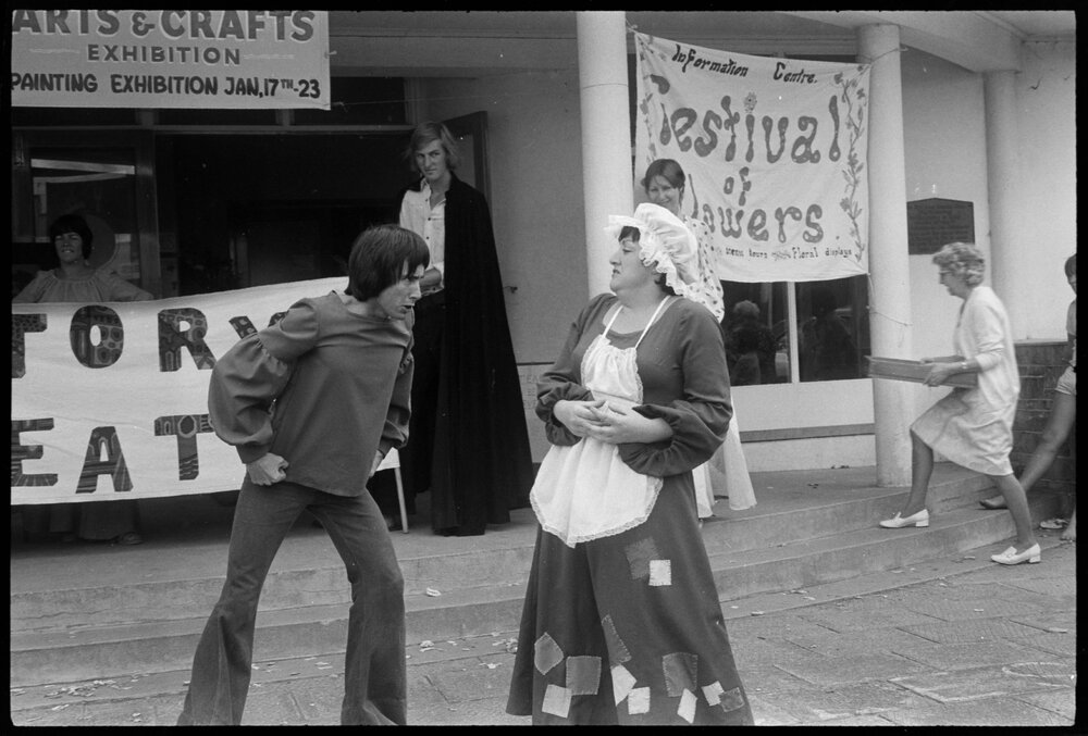 Date21 January 1975Reference Numberphoto gcc-32072DescriptionActors outside the Waihī Memorial Hall during the Waihī Festival. Published 21 January 1975.FormatNegativePhysical Description35mm black-and-white negative (6/7)Photographer/CreatorBay of Plenty Times