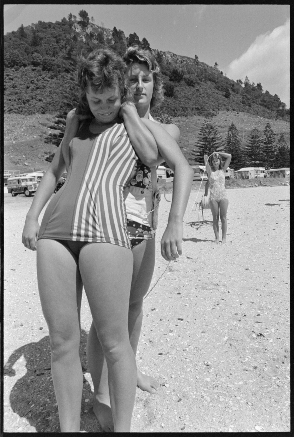 Datec. January 1975Reference Numberphoto gcc-32087DescriptionAn all-girl Whakatāne team works for bronze medal surf lifesaving qualifications during examinations at Mount Maunganui's main beach on Saturday. They are from left, Helen Miller (patient), Desma Scott (beltman), Diane Gibbs (lineman) and Catherine Hudson (reelmani)., Published 20 January 1975.FormatNegativePhysical Description35mm black-and-white negative (1/4)Photographer/CreatorBay of Plenty Times