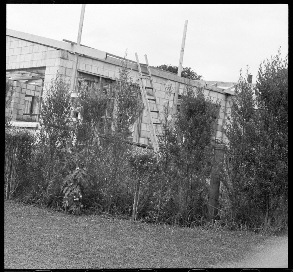 Date23 January 1975Reference Numberphoto gcc-32124DescriptionConstruction of a concrete block building, behind shrubs.FormatNegativePhysical Description35mm black-and-white negative (13/15)Photographer/CreatorBay of Plenty Times