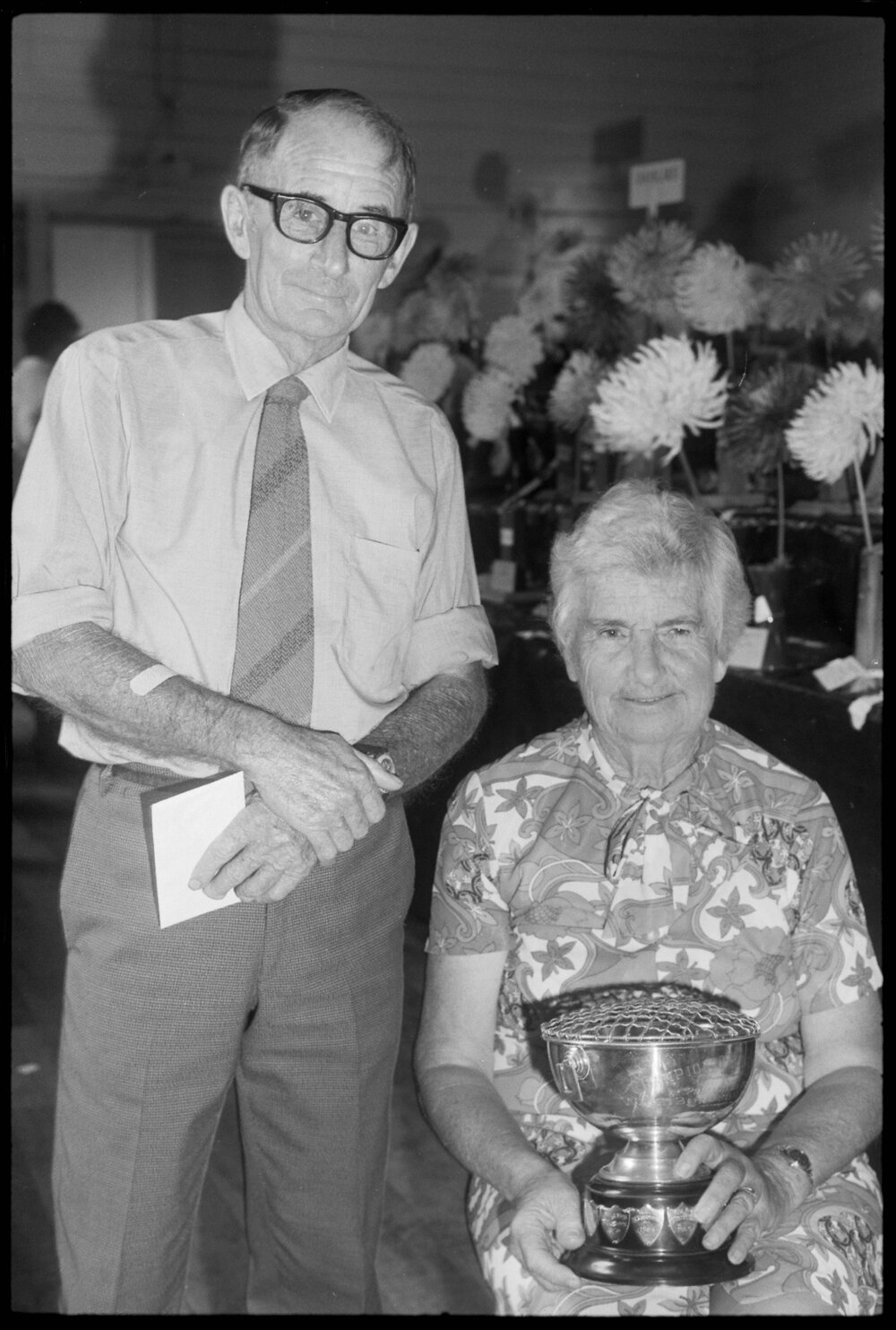 Date23 January 1975Reference Numberphoto gcc-32130DescriptionSecond-time winners of the Waihī Borough Council Cup for the best landscape-type garden in the borough were Mr and Mrs P. B. Cubitt, who are shown with the cup after it was presented to them by the Mayor, Mr A. J. Dean. Published 23 January 1975.FormatNegativePhysical Description35mm black-and-white negative (1/6)Photographer/CreatorBay of Plenty Times