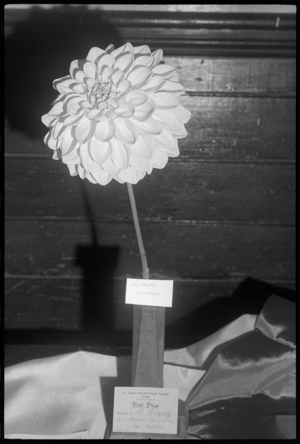 Date23 January 1975Reference Numberphoto gcc-32132DescriptionWaihī dahlia grown by P. Wagstaff wins first prize at the St James Presbyterian Flower show. Published 23 January 1975.FormatNegativePhysical Description35mm black-and-white negative (3/6)Photographer/CreatorBay of Plenty Times