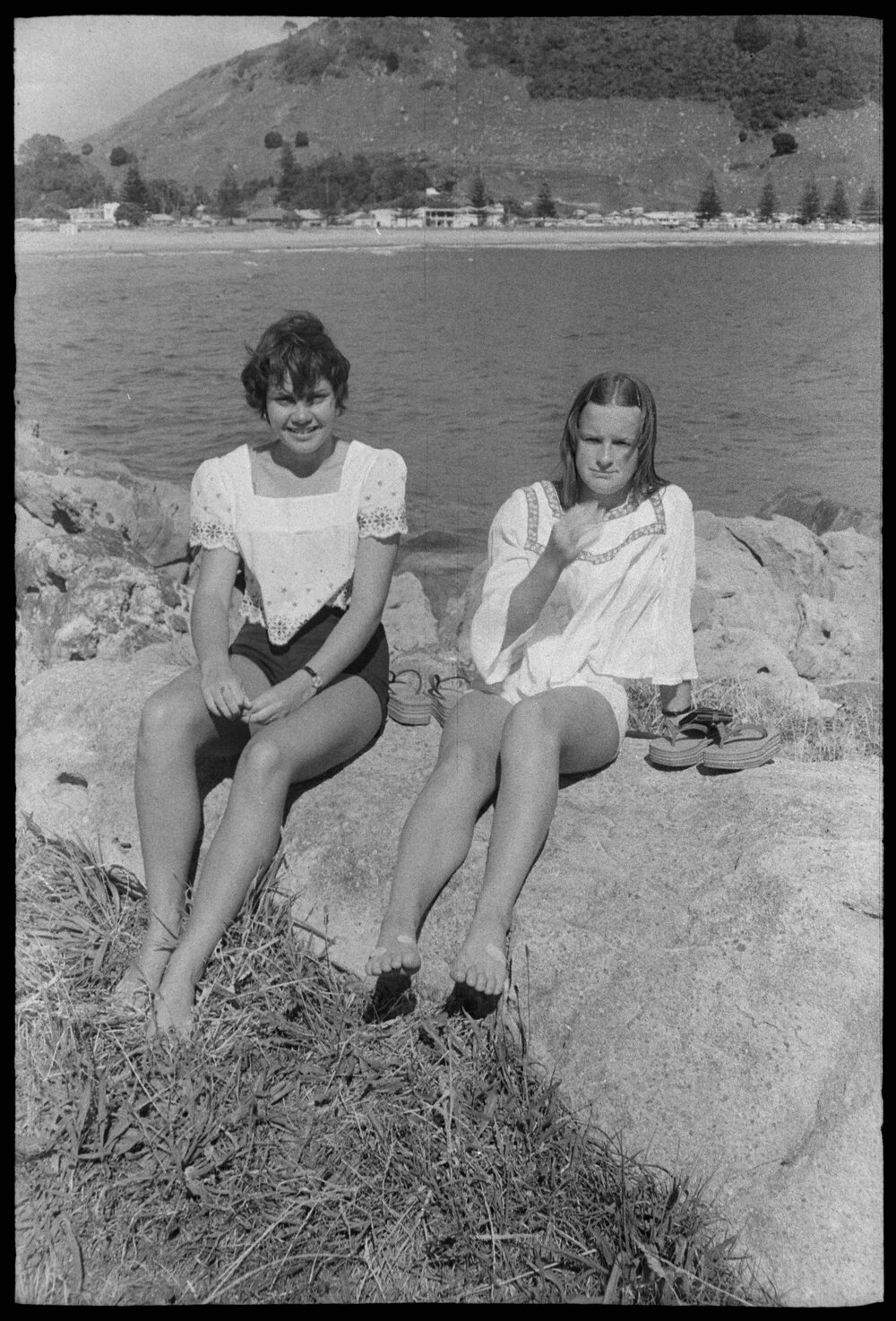Date23 January 1975Reference Numberphoto gcc-32136DescriptionPukekohe girls, Glenda Short and Raewyn Schlaepher, both 15, relax on Moturiki Island. Published 23 January 1975.FormatNegativePhysical Description35mm black-and-white negative (1/6)Photographer/CreatorBay of Plenty Times