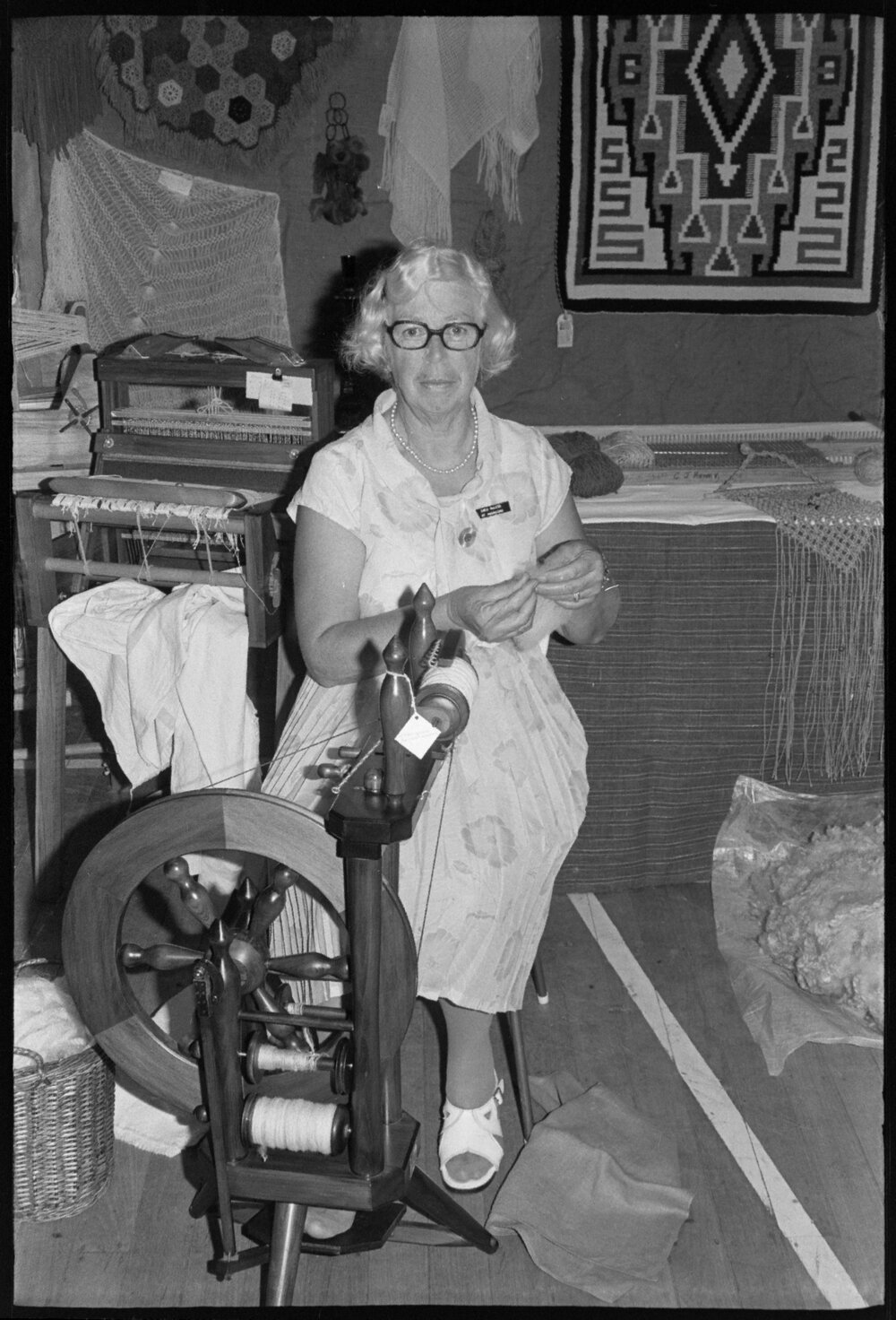 Date23 January 1975Reference Numberphoto gcc-32143DescriptionMrs G. McLeod, the president of the Mount Spinners and Weavers Club, spins natural wool at the club's display at the Mount Maunganui Hobbies Fair. Published 23 January 1975.FormatNegativePhysical Description35mm black-and-white negative (2/2)Photographer/CreatorBay of Plenty Times