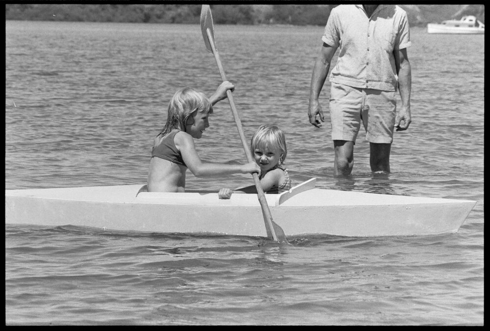 Date24 January 1975Reference Numberphoto gcc-32175DescriptionMemorial Park beach, Tauranga, all is not smooth canoeing as Leanne (8) and Julie (4) McKinnon, of Putāruru, with Dad, J. McKinnon.FormatNegativePhysical Description35mm black-and-white negative (3/3)Photographer/CreatorBay of Plenty Times