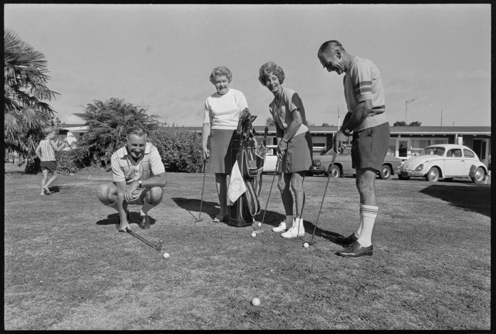 Date24 January 1975Reference Numberphoto gcc-32184DescriptionPractising his putting prior to hitting off in the Bay of Plenty Trotting Club's personality golf tournament at Tauranga, is Mr M. Clarke, a prominent owner-breeder of Auckland. Looking on, from left, are Mrs Clarke, Mr H. C. Fryer, senior stipendiary steward and his wife, also from Auckland. Published 24 January 1975.FormatNegativePhysical Description35mm black-and-white negative (1/5)Photographer/CreatorBay of Plenty Times