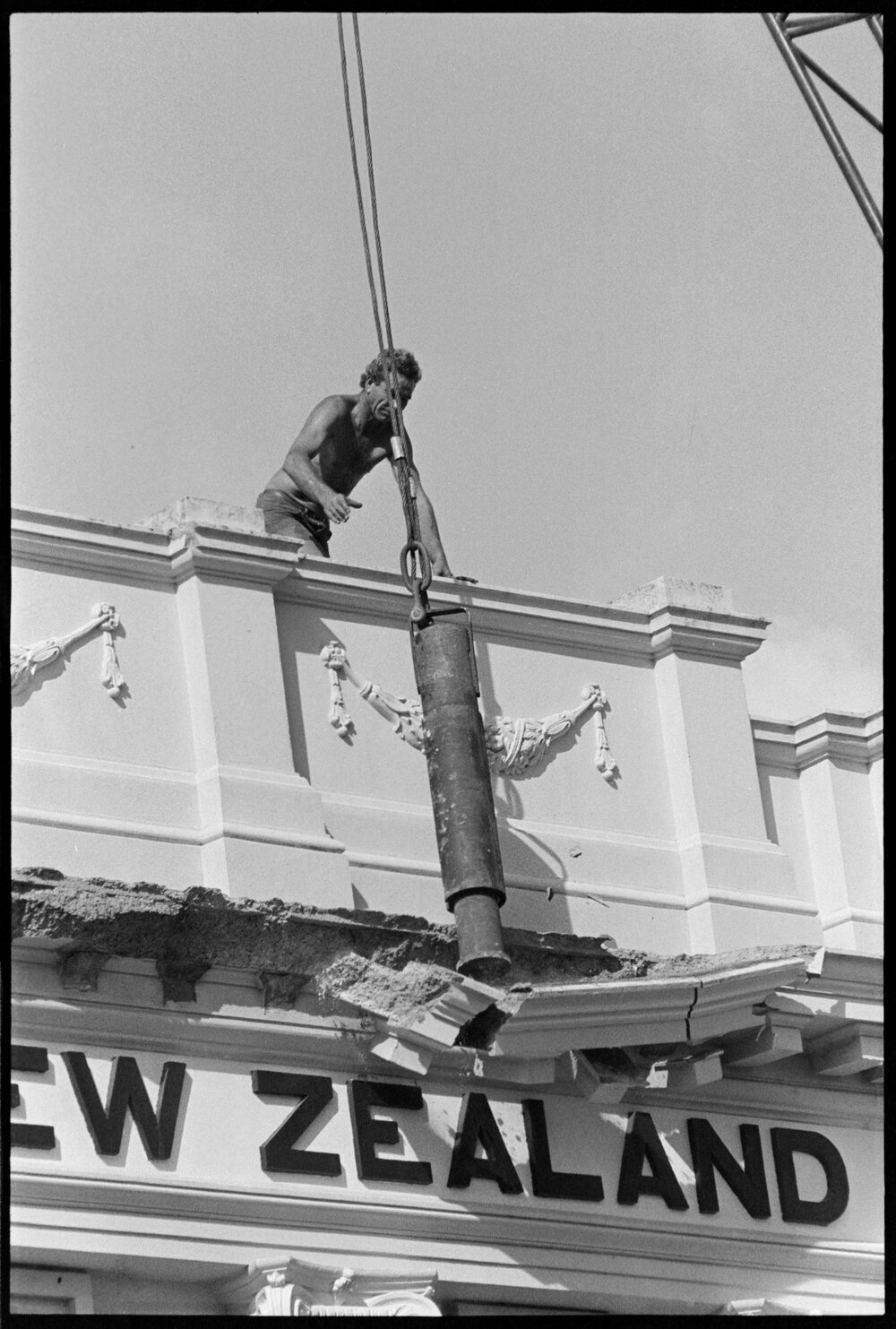 Date27 January 1975Reference Numberphoto gcc-32228DescriptionContractors with a demolition weight chipping the concrete from the facade, in the demolition of the front of the Bank of New Zealand building in Te Puke's main street. Published 27 January 1975.FormatNegativePhysical Description35mm black-and-white negative (4/6)Photographer/CreatorBay of Plenty Times