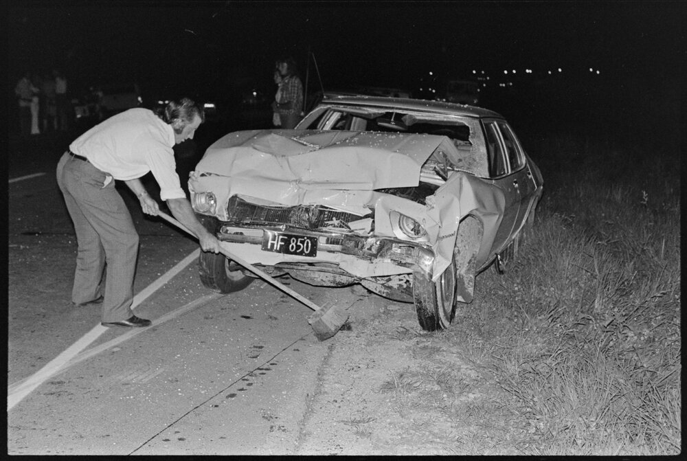 Date25 January 1975Reference Numberphoto gcc-32233DescriptionA vehicle involved in a fatal head-on collision near the Te Maunga junction. Published 25 January 1975.FormatNegativePhysical Description35mm black-and-white negative (3/12)Photographer/CreatorBay of Plenty Times