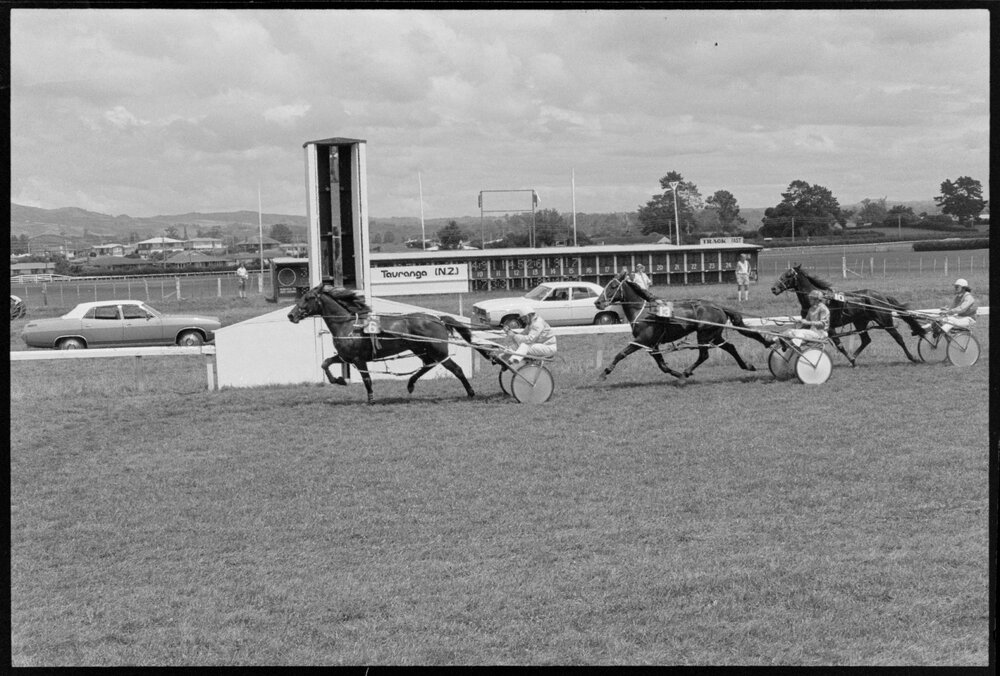 Date27 January 1975Reference Numberphoto gcc-32248DescriptionFinal Curtain driven by Peter Wolfenden winning the feature race of the Bay of Plenty Trotting Club's meeting, the Tudor Hanover Stakes, convincingly downing the glamour four-year-old Josias. Published 27 January 1975.FormatNegativePhysical Description35mm black-and-white negativePhotographer/CreatorBay of Plenty Times