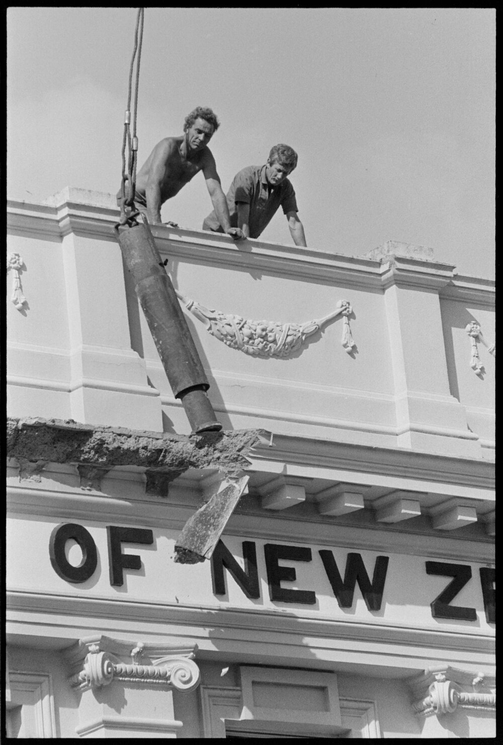 Date27 January 1975Reference Numberphoto gcc-32249DescriptionContractors with a demolition weight chipping the concrete from the facade, in the demolition of the front of the Bank of New Zealand building in Te Puke's main street. Published 27 January 1975.FormatNegativePhysical Description35mm black-and-white negative (1/22)Photographer/CreatorBay of Plenty Times