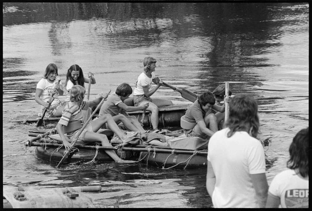 Date27 January 1975Reference Numberphoto gcc-32274DescriptionEntrants in the Paengaroa YFC raft race on the Kaituna River. 27 January 1975.FormatNegativePhysical Description35mm black-and-white negative (4/6)Photographer/CreatorBay of Plenty Times