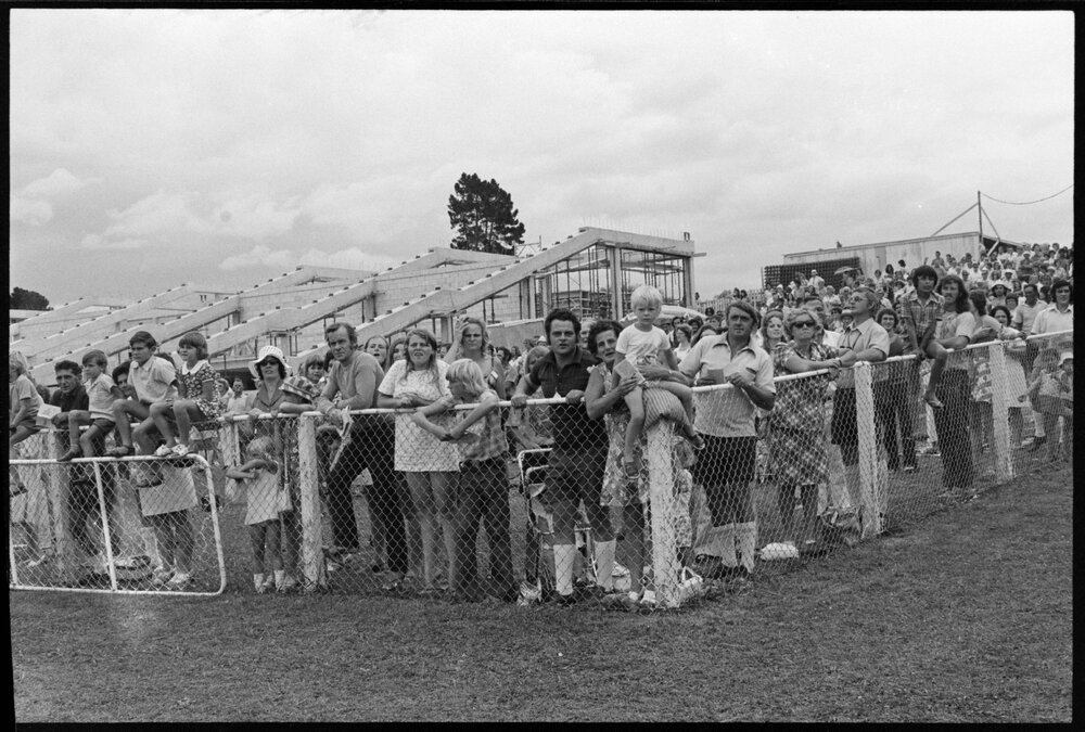 Date27 January 1975Reference Numberphoto gcc-32289DescriptionSpectators at the Tauranga Race Course, standing in front of the grand stands. Published 27 January 1975.FormatNegativePhysical Description35mm black-and-white negative (1/6)Photographer/CreatorBay of Plenty Times