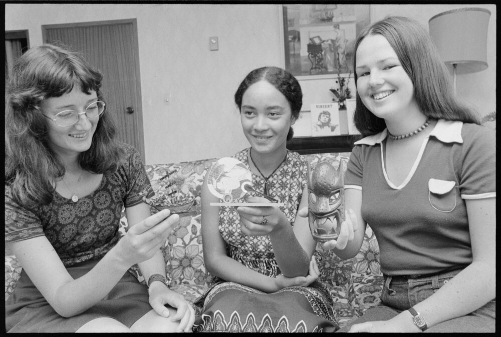 Date22 January 1975Reference Numberphoto gcc-32315DescriptionShowing some souvenirs from their two-week stay in New Caledonia are, from left, Tauranga Girls College students: Misses Margaret Bakker, Aroha Lucas and Annette Doherty, three of a party of 20 students, who travelled with language department head, Mr. R. A. Goldsmith. Published 22 January 1975.FormatNegativePhysical Description35mm black-and-white negative (1/3)Photographer/CreatorBay of Plenty Times