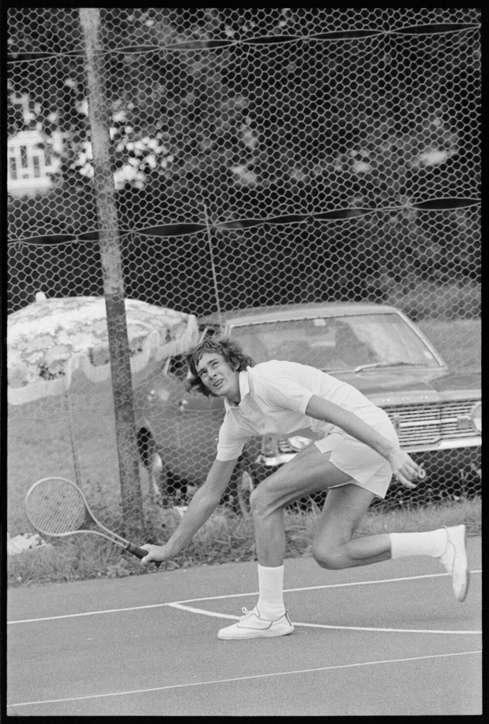 Date28 January 1975Reference Numberphoto gcc-32341DescriptionHank Volmuller, eventually runner-up, of Whakatāne, moves back toward the baseline during the finals of the Bay of Plenty residential tennis championships in Te Puke. Published 28 January 1975.FormatNegativePhysical Description35mm black-and-white negative (7/9)Photographer/CreatorBay of Plenty Times