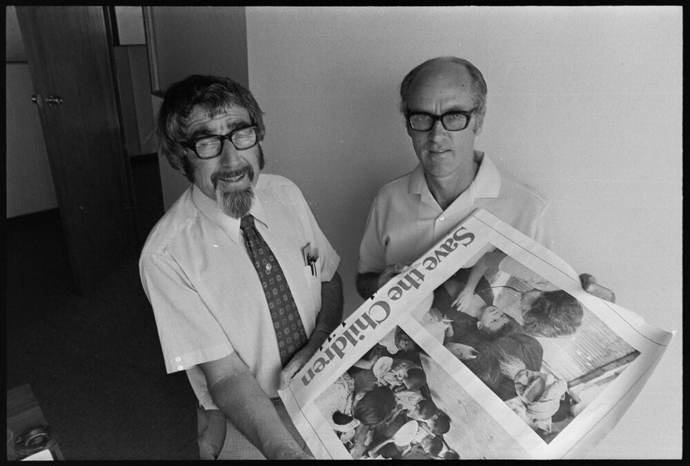 Date29 January 1975Reference Numberphoto gcc-32369DescriptionMr Horner (left), president of the Greerton Lions Club, and the Rev. M. Bowden study a poster which graphically shows the plight of underprivileged children who can be helped by organisations such as Save the Children. Published 29 January 1975.FormatNegativePhysical Description35mm black-and-white negative (1/9)Photographer/CreatorBay of Plenty Times