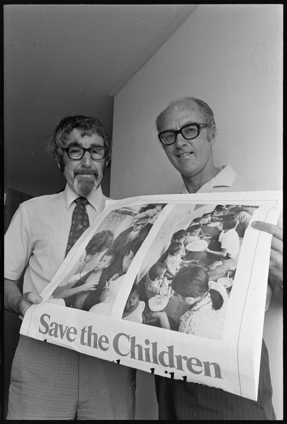 Date29 January 1975Reference Numberphoto gcc-32370DescriptionMr Horner (left), president of the Greerton Lions Club, and the Rev. M. Bowden study a poster which graphically shows the plight of underprivileged children who can be helped by organisations such as Save the Children. Published 29 January 1975.FormatNegativePhysical Description35mm black-and-white negative (2/9)Photographer/CreatorBay of Plenty Times