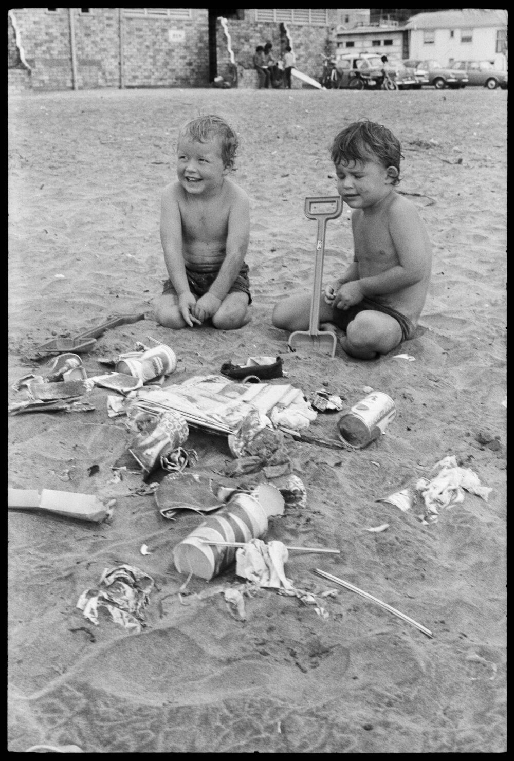 Date30 January 1975Reference Numberphoto gcc-32393DescriptionLooking at some of the litter from the aftermath of the Northern Regional Surf Carnival which was scattered over Waihī Beach yesterday are Michael Lynch, aged 4, and his three-year-old brother, Phillip, of Pātea. Published 30 January 1975.FormatNegativePhysical Description35mm black-and-white negative (1/3)Photographer/CreatorBay of Plenty Times