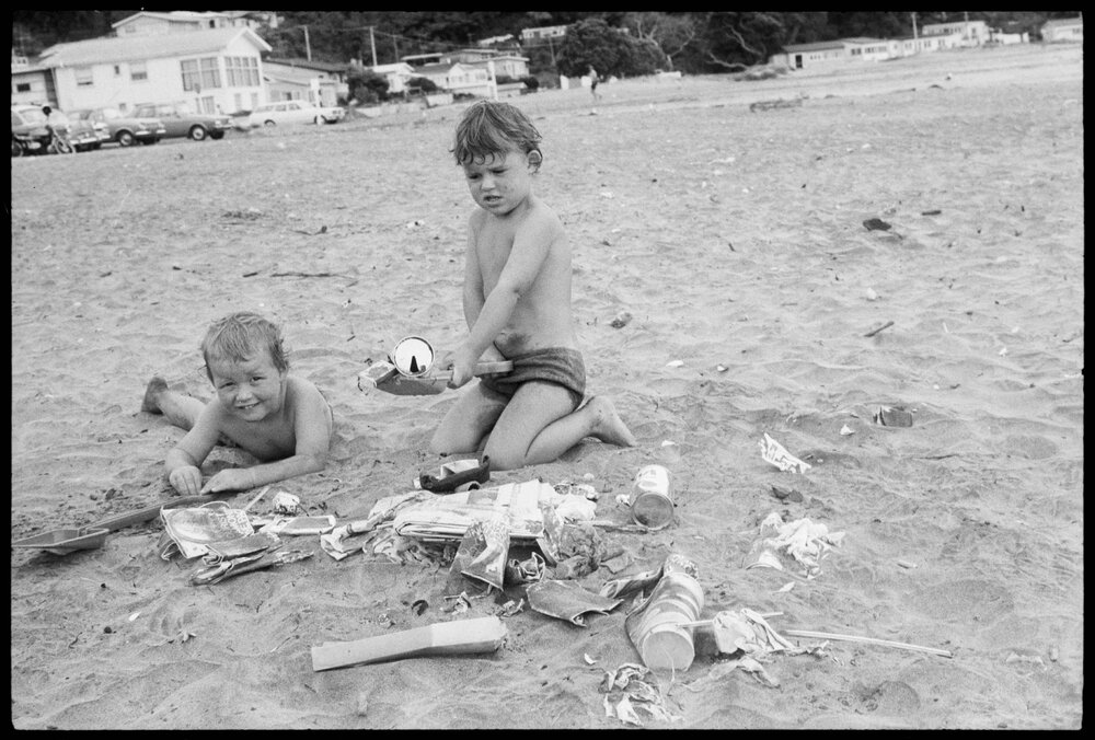 Date30 January 1975Reference Numberphoto gcc-32395DescriptionLooking at some of the litter from the aftermath of the Northern Regional Surf Carnival which was scattered over Waihī Beach yesterday are Michael Lynch, aged 4, and his three-year-old brother, Phillip, of Pātea. Published 30 January 1975.FormatNegativePhysical Description35mm black-and-white negative (3/3)Photographer/CreatorBay of Plenty Times